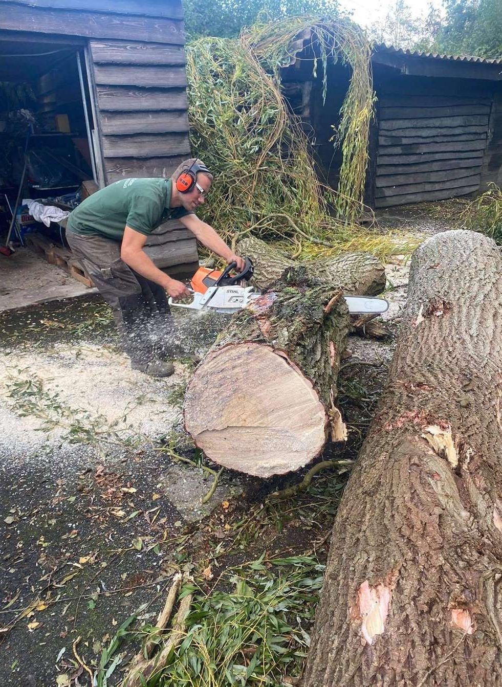 Dikke boomstammen kunt u klieven en gebruiken voor in de open haard of gezellig een spel op te nagelen. Takken hakselen wij terplaatse wat u kunt gebruiken om je tuin te verrijken. U kunt ook het houtafval aan ons over laten. We nemen het hout, takken, bladeren, ect. mee en zetten indien nodig een container in, terug een zorg minder voor u.